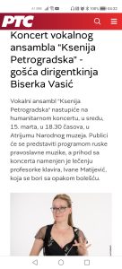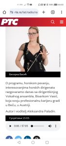 ~ Медији ~ Гостовање у Радио Београду, емисија „Сусретања“, аутор и водитељ Александра Паладин Сазнај више ... Студио Артем Сонум,You Tube канал Сазнај више ... Студио Артем Сонум,You Tube канал Сазнај више ... Вокални ансамбл „Света Ксенија Петроградска“